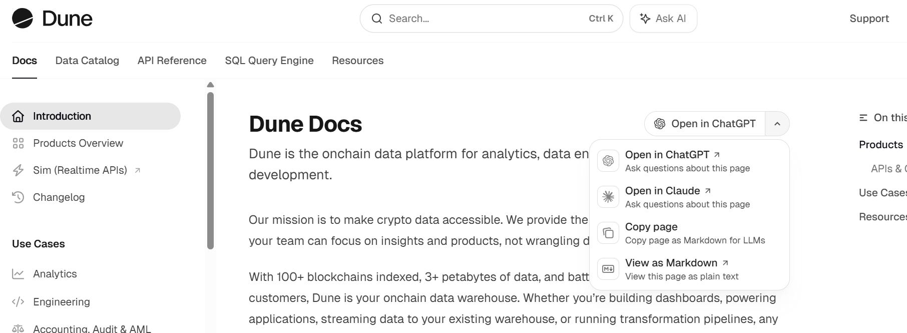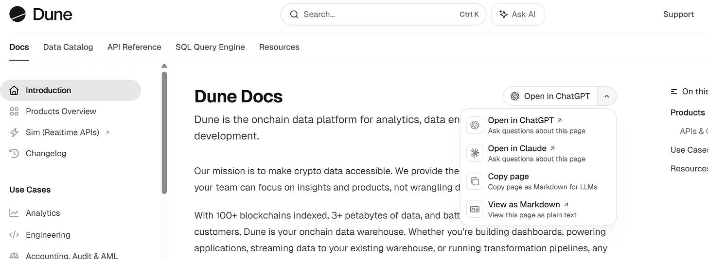 Dune permite conectar su documentación directamente con ChatGPT o Claude. Pídele: “Crea una consulta para Dune que me muestre las transacciones diarias en la red Base”. Si te da error, pega el fallo en el chat y que la IA lo arregle. Iteración a iteración, el potencial es infinito.