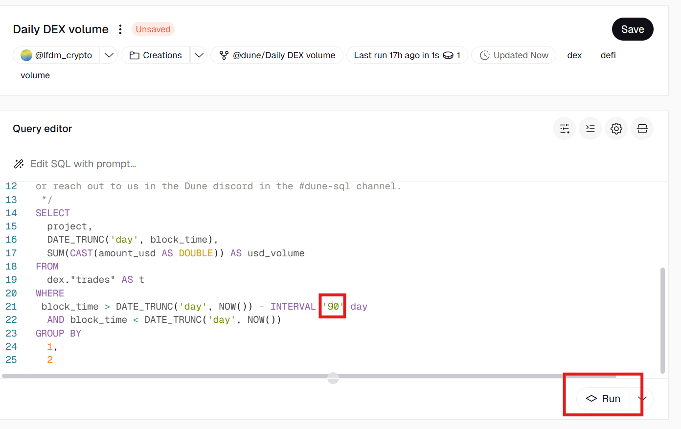 Volumen diario en Dexes, de @hagaetc. Fuente: Dune Hice un fork, busqué en el código donde ponía “30”, escribí “90” y le di a ejecutar.
